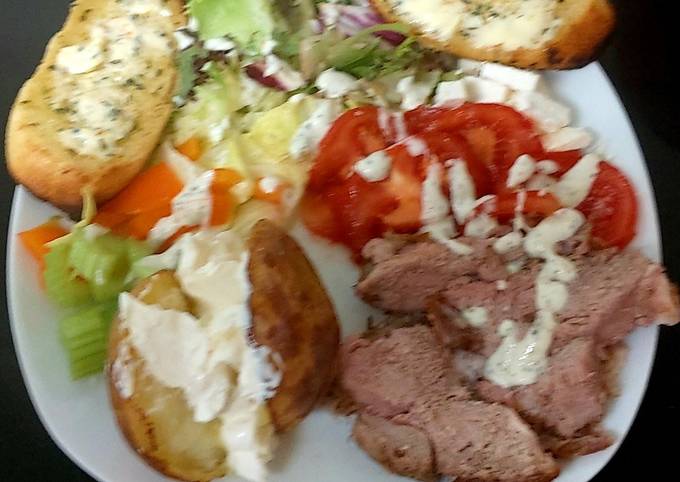 Steps to Prepare Speedy My Garlic Lamb Salad with jacket Potato, tomato, lettuce, Feta cheese